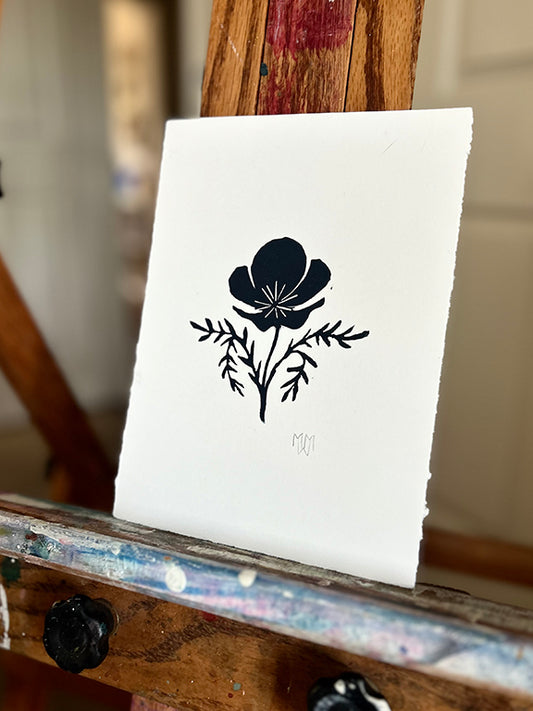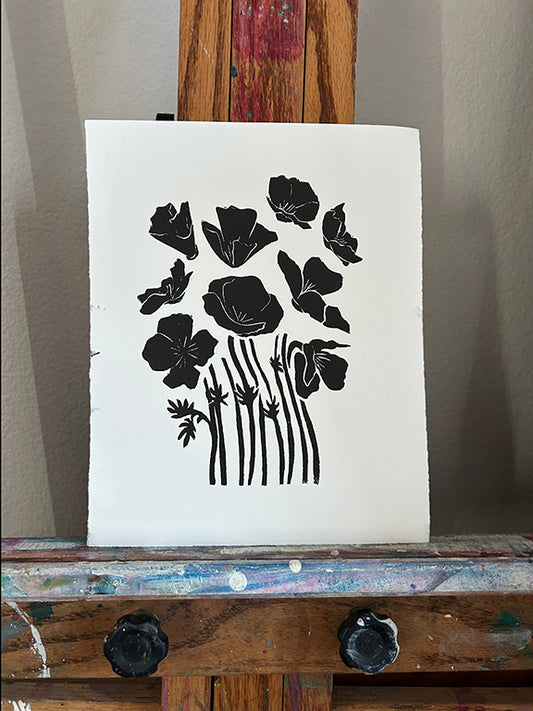 California Poppies - Original Hand Pulled Linocut Print B&W