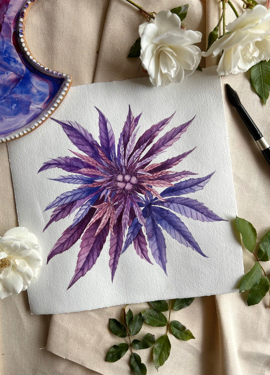 Purple Cannabis Flower Original Watercolor Painting 8x8"