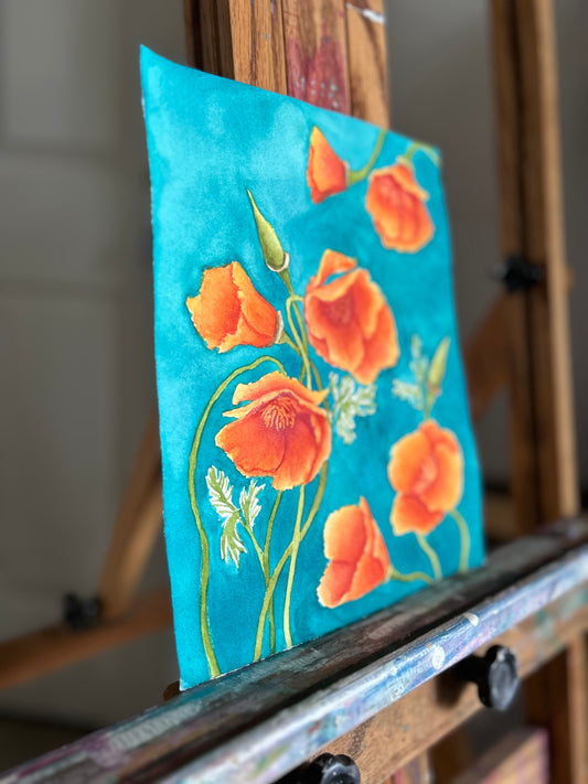 Golden Poppies on Teal Original Watercolor Painting - 8x10"