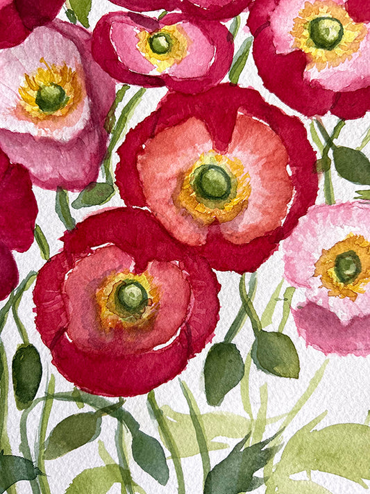 Red Shirley Poppies Original Watercolor Painting - 11x15"