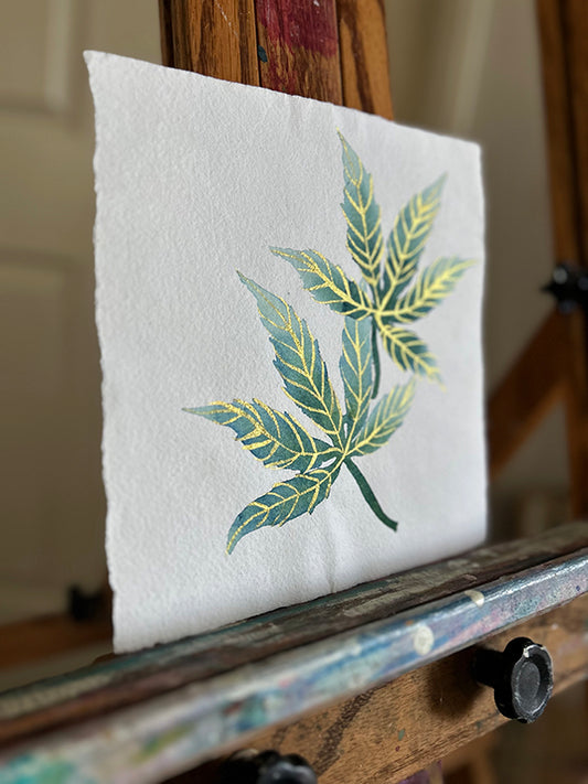 Cannabis Leaves with Gold Original Watercolor Painting 8x8"