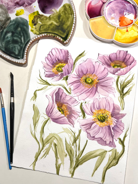 Lilac Poppies Original Watercolor Painting - 9x12"